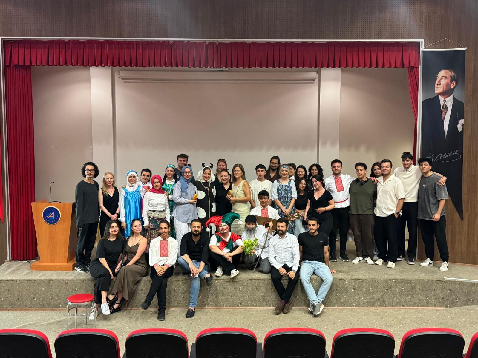 Bumin Kağan Konferans Salonu’nda sahnelenen oyun Dr. Öğr. Üyesi Fatih Düzgün, 3. sınıf öğrencisi Svetlana Zakhvataeva ve 1. sınıf öğrencisi Melissa Çınaroğlu’nun yönetmenliğinde hazırlandı.